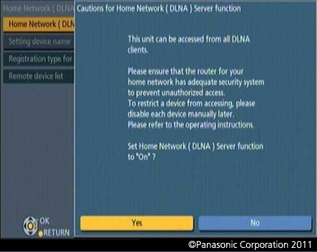 Select “Home Network (DLNA) Server function” in the Home Network (DLNA) Server Settings using your IR remote control.